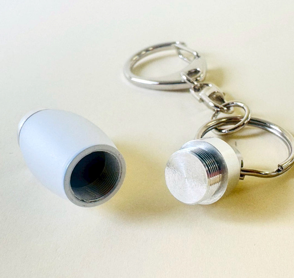 コロンとした形がかわいいカプセルです。チェーンや革紐に付け替えるとネックレスとして身につけることも可能です。